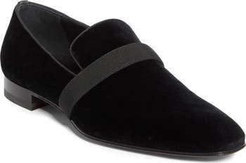 Clean, sophisticated lines define a wardrobe-staple Venetian loafer done in all-occasion black velour and given a hint of dimension with an elastic band wrapping the vamp. Christian Louboutin's iconic red sole underscores each step with a flash of distinctive brilliance.