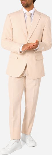 Classic, comfortable and a little bit of fun, this sunny, sand-colored suit features padded shoulders and a tailored silhouette to give the jacket a formal look that's more at home in less-formal settings. It comes with flat-front trousers that sit comfortably at the waist and a matching tie to keep you looking as coordinated as you are smart.