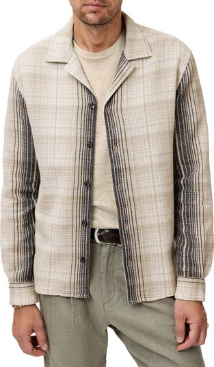A shadowy pattern puts a modern spin on this retro camp shirt made from textural woven cotton in a regular fit that looks good layered or solo.