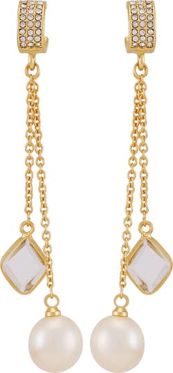 Discover a modern classic with these chic Vince Camuto drop earrings. Each earring boasts a striking post adorned with glittering pavé crystals, leading to a sleek chain. Dangling from the chain is a captivating geometric clear crystal, followed by a radiant pearl. This unique combination creates a timeless yet contemporary accessory, ideal for both day and evening wear.