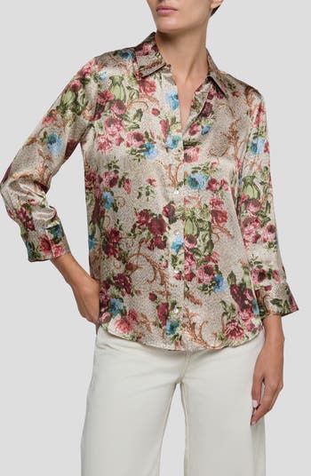 A tapestry-inspired flroal print pops on this button-up shirt made of cool silk with three-quarter sleeves and a graceful, relaxed drape.