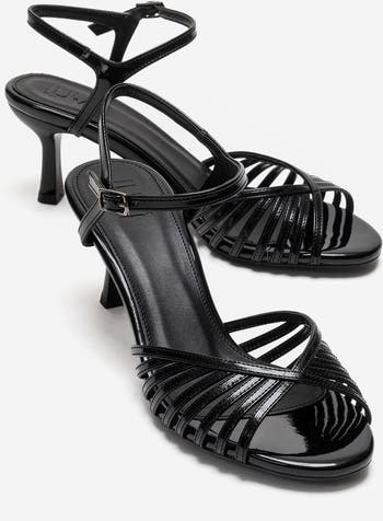 A sleek patent-inspired stiletto defined by slim straps and a refined silhouette