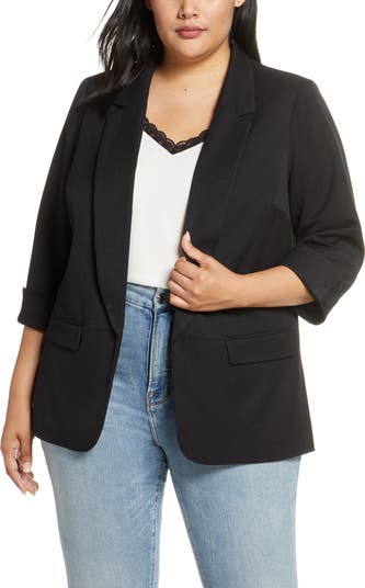 Get to work in this polished and functional blazer styled with rolled three-quarter sleeves and a versatile open front.