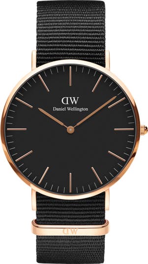 A lightweight round case is the epitome of graceful simplicity with it's clean dial rounded by stick indexes on a sturdy woven strap.