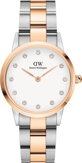 Czech crystals sparkle from the hours on a two-tone watch illuminated by polished accents and set on a coordinating three-link bracelet. The glistening markers are from Crystal Valley, Czechoslovakia, a region with 470 years of glassmaking using natural resources, making it one of the oldest operations in Central Europe utilizing traditional manufacturing and high-quality craftsmanship.