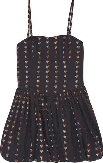 Cotton lurex with silver and gold hearts. Smocked and gripper elastic. Pull-on style. Flattering bubble shape.
