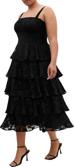 A flowery jacquard enhances the texture and romance of this sleeveless midi topped with a smocked-back bodice and finished with floaty layered ruffles.