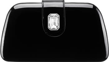 A faceted jewel embellishment makes a glamorous statement on an occasion-ready clutch fashioned with an optional chain strap for easy wear.