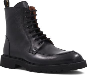A lace-up design and water-resistant finish distinguish a streamlined leather boot featuring an apron toe and durable rubber lug sole.