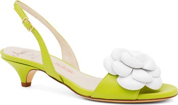 A dimensional floral embellishment adds a breath of fresh air to this enchanting kitten-heel sandal complete with a cushioned, arch-supporting footbed.