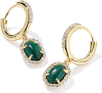 Crystal haloes frame malachite in these geometric drop huggie hoops that instantly elevate your ensembles.