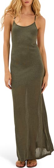 Feel your most carefree as you make the shoreline your stage in this lightweight, stretch-enhanced maxi dress made with a flirty open bakc and sun-reflecting goldtone hardware.
