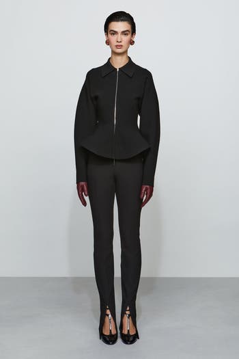 Fit-and-flare jacket in sculpting compact knit with a crisp peplum hem and exposed front zip. Finished with signature silver hardware at the back collar—tailored, versatile, and undeniably the moment.