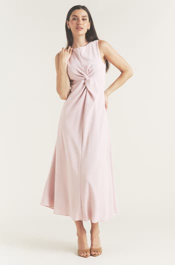 The Daphne Twist Front Midi Dress fuses chic elegance in a classic style. A thoughtfully placed knot detail adds a touch of modernity to a classic shape, flattering across the midriff. Its full flowing midi skirt drapes beautifully into a bias cut, adding to this sophisticated silhouette. The soft crepe fabric has a slight stretch to provide give, ensuring you feel relaxed yet refined.