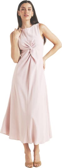 The Daphne Twist Front Midi Dress fuses chic elegance in a classic style. A thoughtfully placed knot detail adds a touch of modernity to a classic shape, flattering across the midriff. Its full flowing midi skirt drapes beautifully into a bias cut, adding to this sophisticated silhouette. The soft crepe fabric has a slight stretch to provide give, ensuring you feel relaxed yet refined.