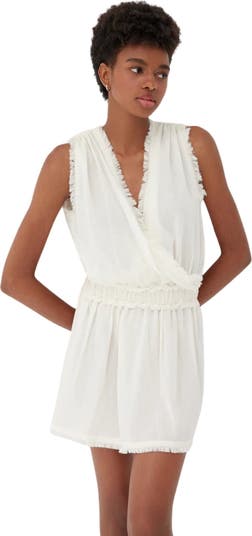 Introducing our Daphne Ecru Cotton Sleeveless Dress; the must have beach day cover up. This mini dress features ruffled sleeves and hemline, with a elasticated detailed waist and a V neckline for an elegant and lightweight beach cover up.