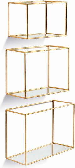 This set of mirrored wall shelves are a contemporary take on chinoiserie style. Smooth and refined, they are scaled to work well in the smaller space. The gold finish and mirrored surface add a sense of light and reflection. Add small vases or series of objets for a touch of refinement.