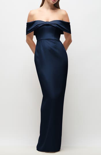 A lovely neckline bow charms this shoulder-baring gown made from crepe satin and finished with an airy back slit for graceful movement.