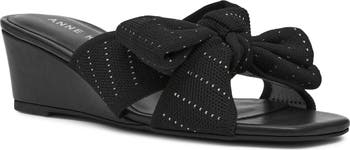 A knotted bow tops this woven wedge sandal shaped with wide crossover straps for an easy blend of height and casual charm.
