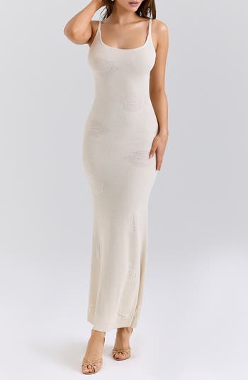 Tonal rose embroidery adds the sweetest of detailing to a ribbed-knit maxi dress that clings to your curves while shimmering threads perfectly capture and reflect light.