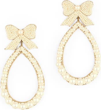 Polished faux-pearls and beaded bows meet in graceful teardrops on these delicate drop earrings that shine with soft elegance.