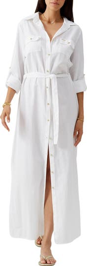 Glimmering golden buttons shine on a utilitarian-inspired shirtdress cut from a breezy cotton-and-linen blend that's perfect for lounging poolside before grabbing lunch with friends.