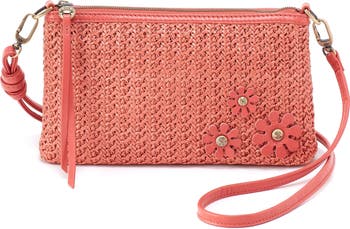 Aged-finish hardware and floral appliqués highlight the slender profile and woven exterior of a versatile crossbody bag featuring multiple straps for on-the-go convenience.