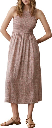 Romantic florals bloom across this sleeveless midi dress designed with a smocked bodice that hugs comfortably. Cut from flowy fabric woven with linen, it falls into an easy shirred skirt with side pockets for a look that's equal parts relaxed and refined.