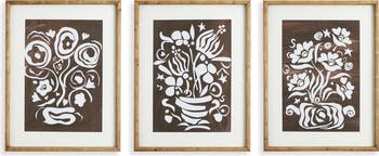 Made of whimsical cut out designs from the original artwork of Susan Nastasic, this playful set of three floral motifs are finished off with a printed mat and frames. In a warm neutral palette, a great set for den, family room or kitchen.