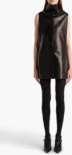 Known for her dark, cinematic aesthetic, Cate Holstein brings a New York realness to her fall '25 collection with pieces like this runway-featured minidress in glossy lambskin leather. The sleeveless, shift silhouette is given dimension in grid-like panels and its slouchy funnel neck.