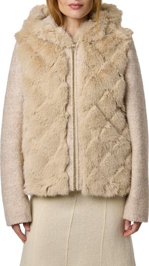 Plush diamond-patterned faux fur combines with woolly bouclé in this cozy hooded jacket that's a standout layer for cold-weather dressing.