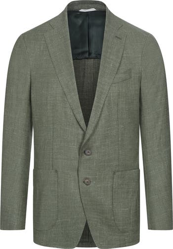 A subtly textured blend of wool, silk and linen in a forest green relaxes the formality of a sport coat designed with rounded shoulders emphasizing its unconstructed tailoring. Lightweight and partially lined, it pairs well with relaxed silhouettes and easily complements your favorite elevated and warm-weather looks.