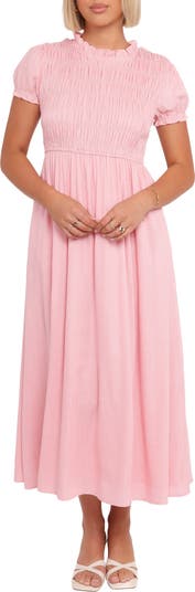 A smocked bodice shapes this silhouette of this dreamy midi dress framed by charming puff sleeves and made from a lightweight linen-kissed fabric.