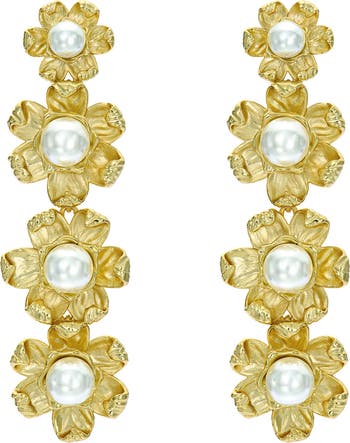 Faux pearls illuminate the center of each flower-shaped drop that sweeten linear earrings finished with a rich texture and high shine.