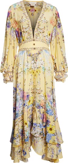 The limited-edition print displays a garden's worth of blooms on this long-sleeve silk dress fashioned with blousy balloon sleeves, a plunge neckline and a highly ruffled high-low hem. Diamante sparkles along the borders, while embroidered organza appliqués flutter at the cuffs.
