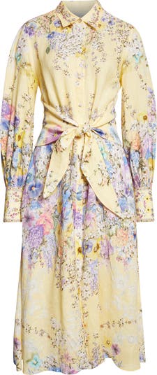 Beautiful pastel flowers bloom throughout the dreamy yellow backdrop of this crystal-embellished shirtdress handcrafted from airy linen. Balloon sleeves and a tie detail at the waist bring playful volume to the sweeping silhouette.