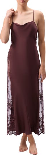 Bias-cut satin beautifully glides down your figure in this romantic nightgown elegantly detailed with sheer full-length side lace panels and a cowl neck.