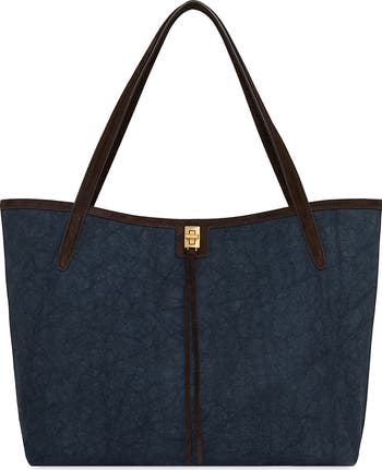 Get out and about with this leather-trimmed denim tote boasting a roomy interior framed by a gleaming twist-lock closure and polished side studs.