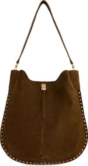 Fringy strands hang from the clasp of this slouchy suede hobo that's traced with studs down the sides for signature Rebecca Minkoff style.