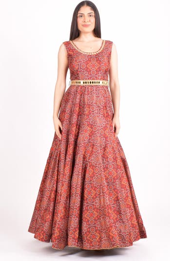 The Darrie Gown features an all-over bandhani print in a rich maroon shade, designed in a polyester-silk blend that drapes beautifully. It comes with a golden mirror belt that adds a refined touch of sparkle.