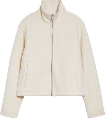 A waist-skimming wool jacket is crafted with clean lines for a cozy-yet-polished layering look.