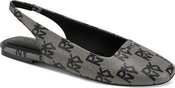 Gleaming logo hardware brands a square-toe flat fitted with a cushioned footbed and stretchy slingback for daylong comfort.