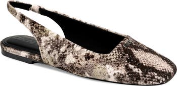 Gleaming logo hardware brands a square-toe flat fitted with a cushioned footbed and stretchy slingback strap for daylong comfort.