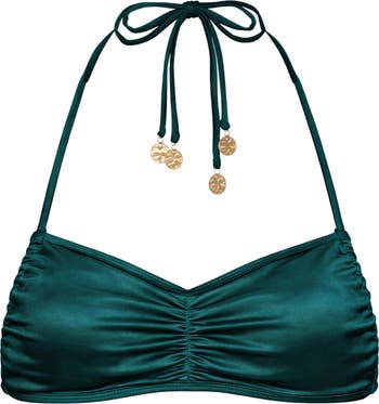 The Darya top features a classic triangle silhouette reimagined with a rich Mediterranean print and a delicate teal trim. Designed for a custom fit, it includes adjustable straps and open ties finished with signature gold tips, while removable padding allows for versatile support and shape