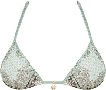 The Darya top features a classic triangle silhouette reimagined with a rich Mediterranean print and a delicate teal trim. Designed for a custom fit, it includes adjustable straps and open ties finished with signature gold tips, while removable padding allows for versatile support and shape