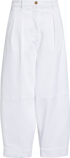 The label's impeccable tailoring is showcased with these soft cotton-blend pants sewn in a pleated, barrel-leg silhouette polished with crisp creases.