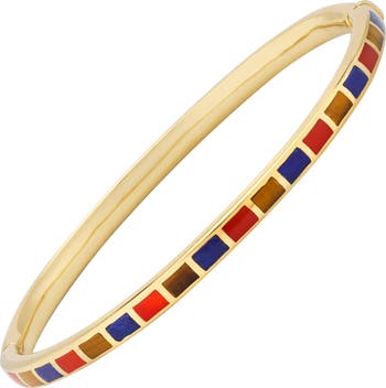 Rectangles of genuine gemstones are set by hand onto lightweight 925 sterling silver bangle bracelet in a luxurious 18K gold vermeil finish.