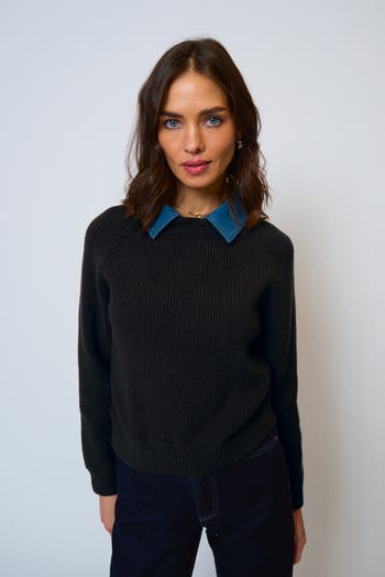This stylish knit top features a unique denim-style pointed collar detail.\nIt includes a comfortable V-neckline and a button-up front placket.\nThe long sleeves and relaxed fit make it perfect for casual wear.\nA versatile piece that blends the comfort of a knit with a touch of denim style.