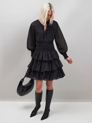 This stunning Mini Dress enhances any wardrobe with its elegant dash print and tiered design, offering both style and comfort. Perfect for day or night, it's a must-have piece.