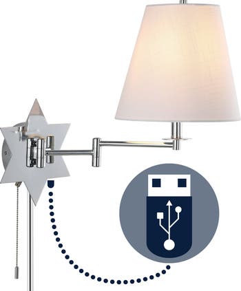 With a versatile design, this contemporary swing-arm sconce can be plugged in or hardwired in any space. With a unique star design on its base and light cotton shade, this sconce adds an element of glam to any bedroom or living area. Even with its vintage aesthetic, this sconce boasts an easy-to-use USB port for the charging of mobile devices.